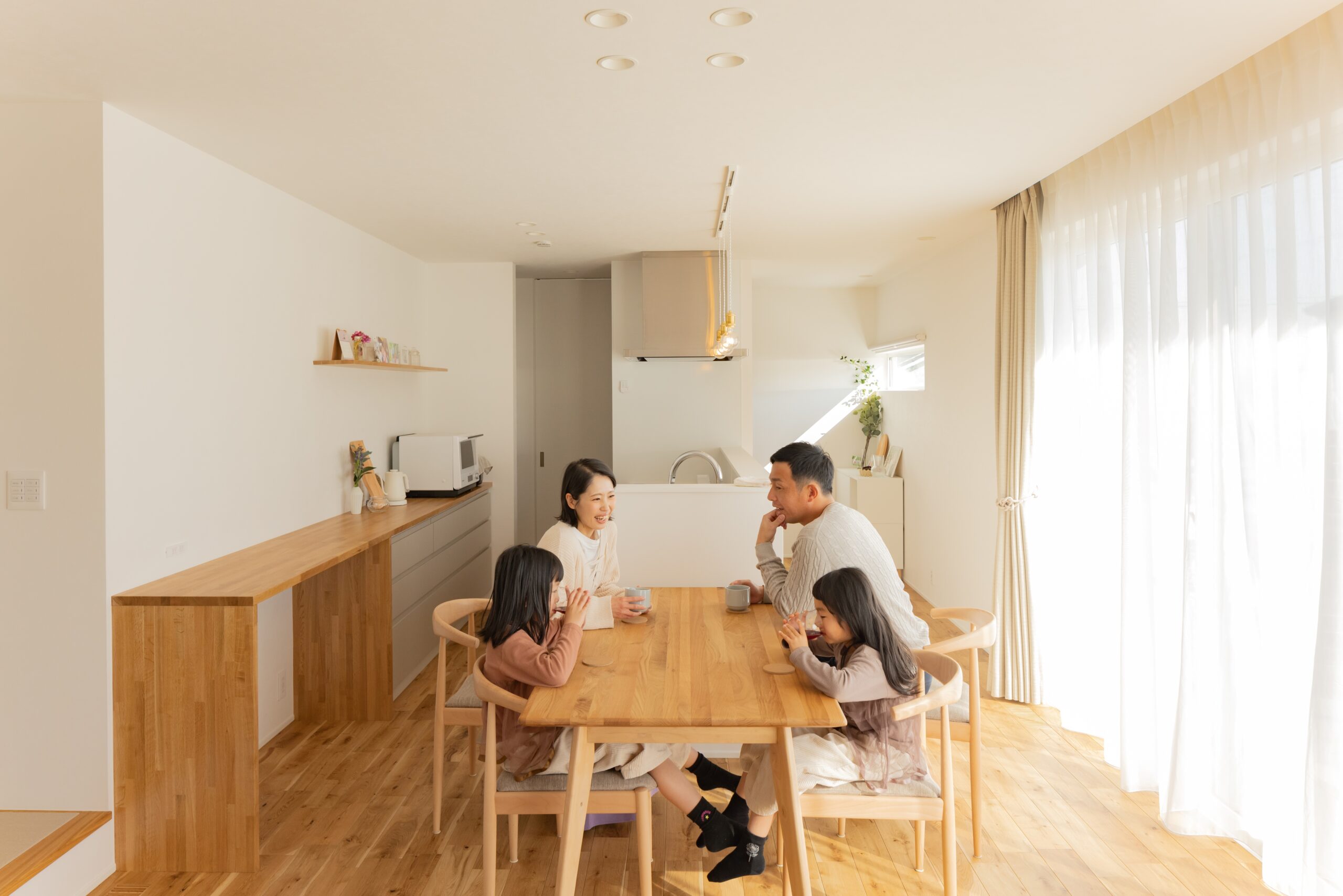 LDKの中心にテーブルを据え、家族が自然に集い、寄り添える間取りに。キッチンカウンター右側のグレーの面材は別注したこだわりの色。左側のスペースは椅子を置いて、子どもたちのスタディーコーナーとして活用予定。