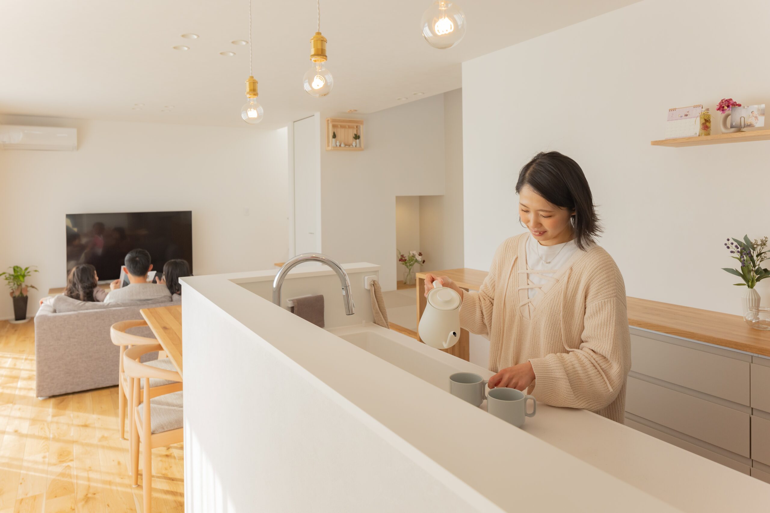 たっぷり収納で使いやすいキッチン。腰壁を高めに設定することで床への水、油の飛散を防ぐことができ、目隠しにもなるので急な来客時にも安心。キッチン上部の照明が空間に温もりを添えている。