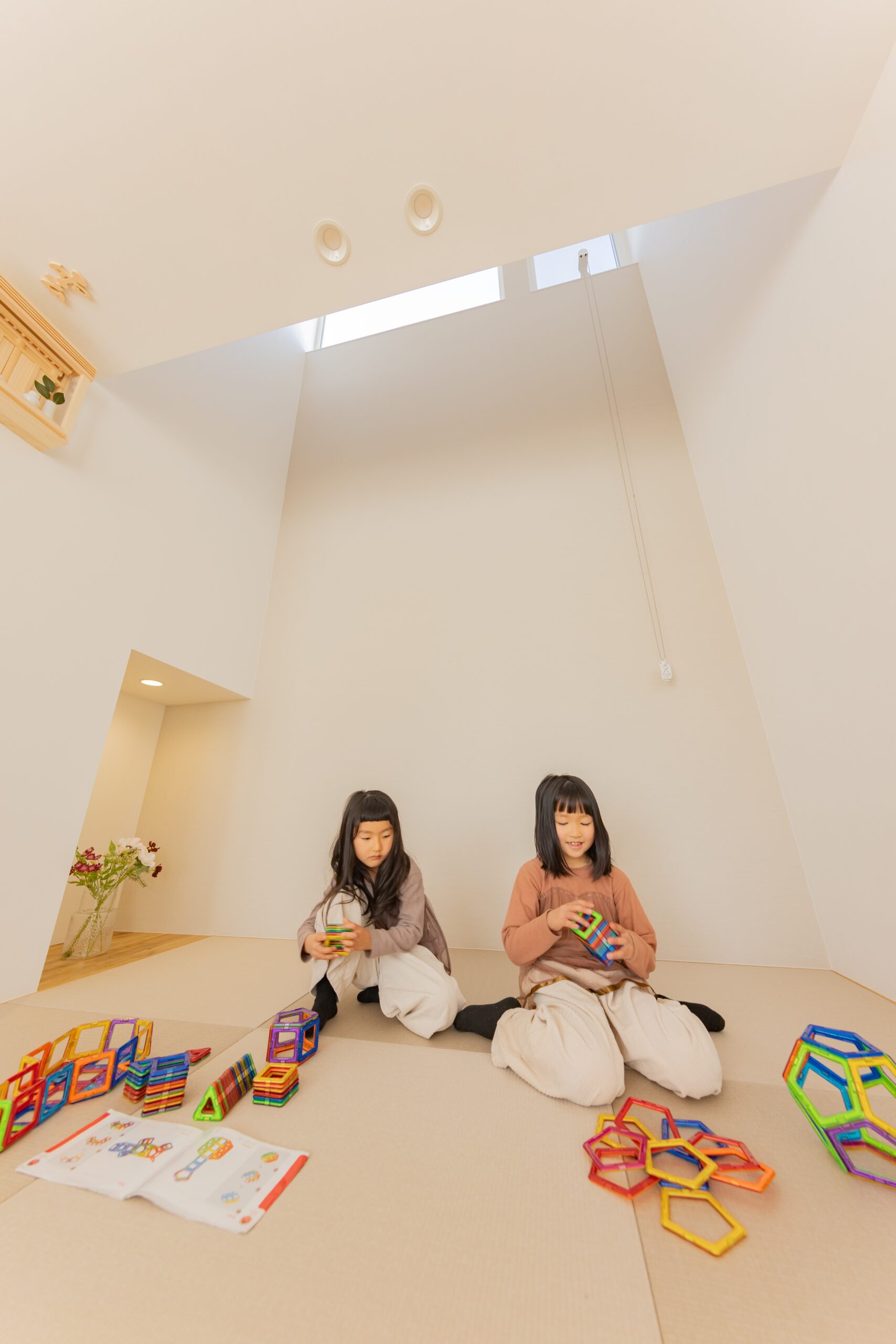 小上がりの和室は一部吹抜けになっており開放感たっぷり。子どもたちが遊んだり、昼寝をしたりと欠かせないスペース。奥さまは気が早くも、将来ここで孫の世話をする日を思い描いているそう。
