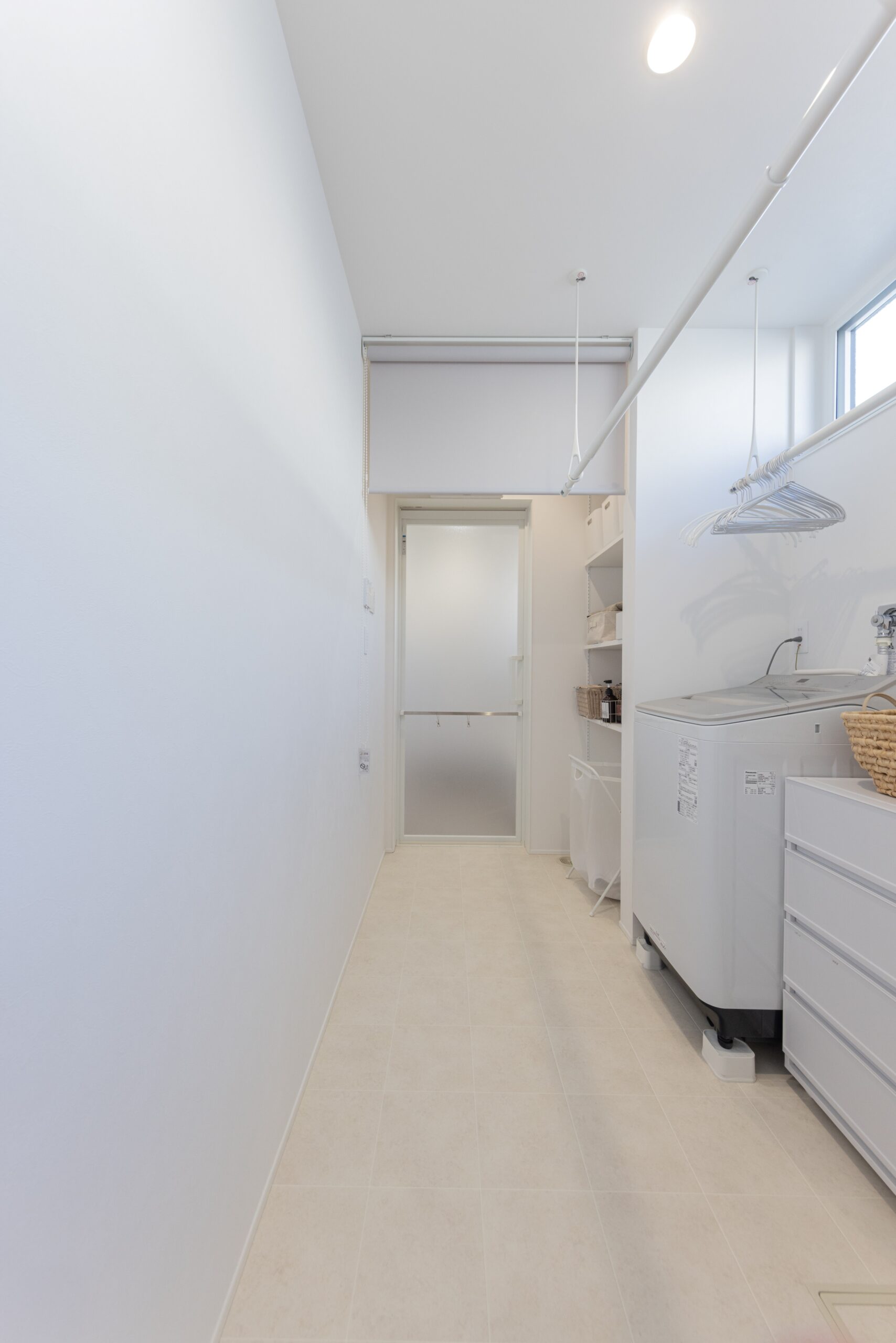 浴室とランドリースペースの目隠しとしてロールスクリーンを設置。