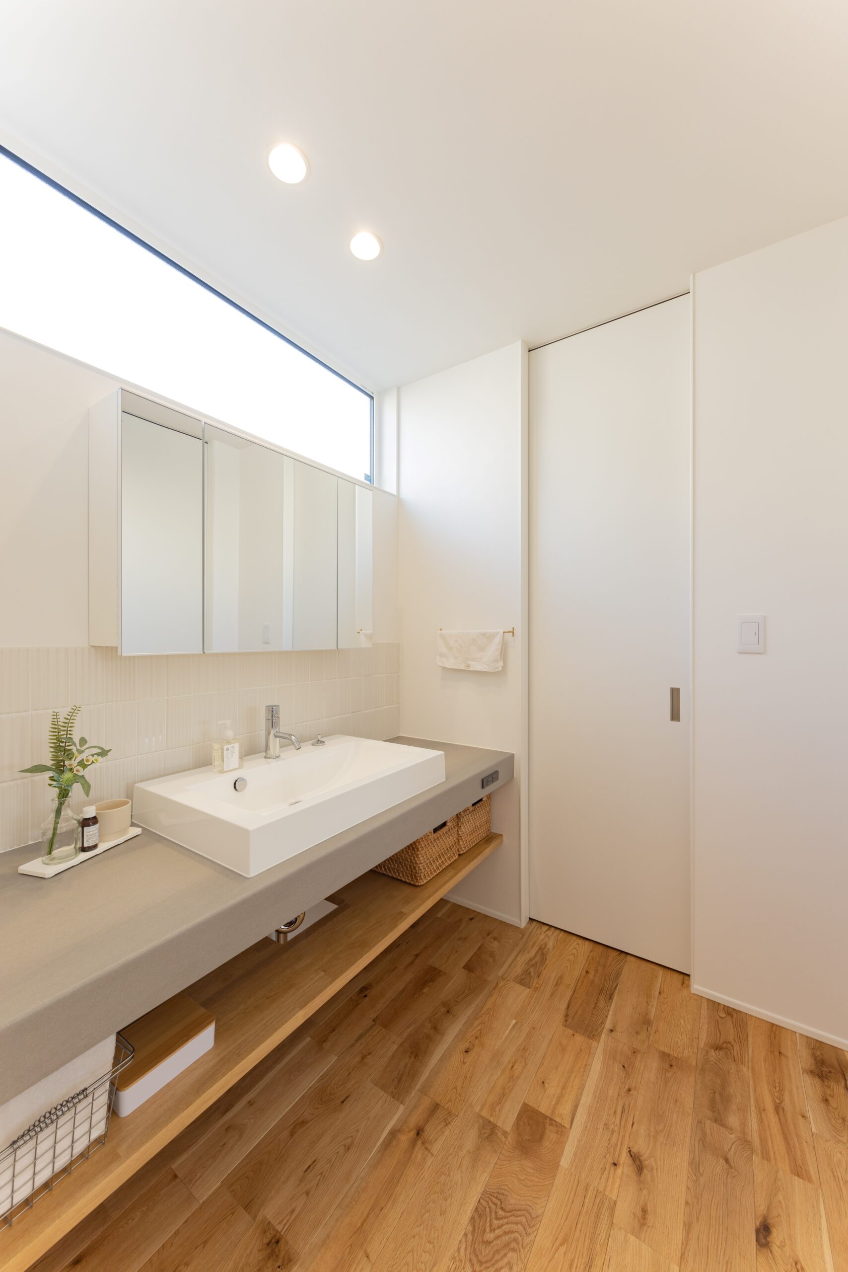 洗面スペースは、女性3人が立っても余裕がある広さにした。タイルの向きを縦にするか横にするかで悩みに悩んだ末、縦にして大正解ここもお気に入りの場所になった。
