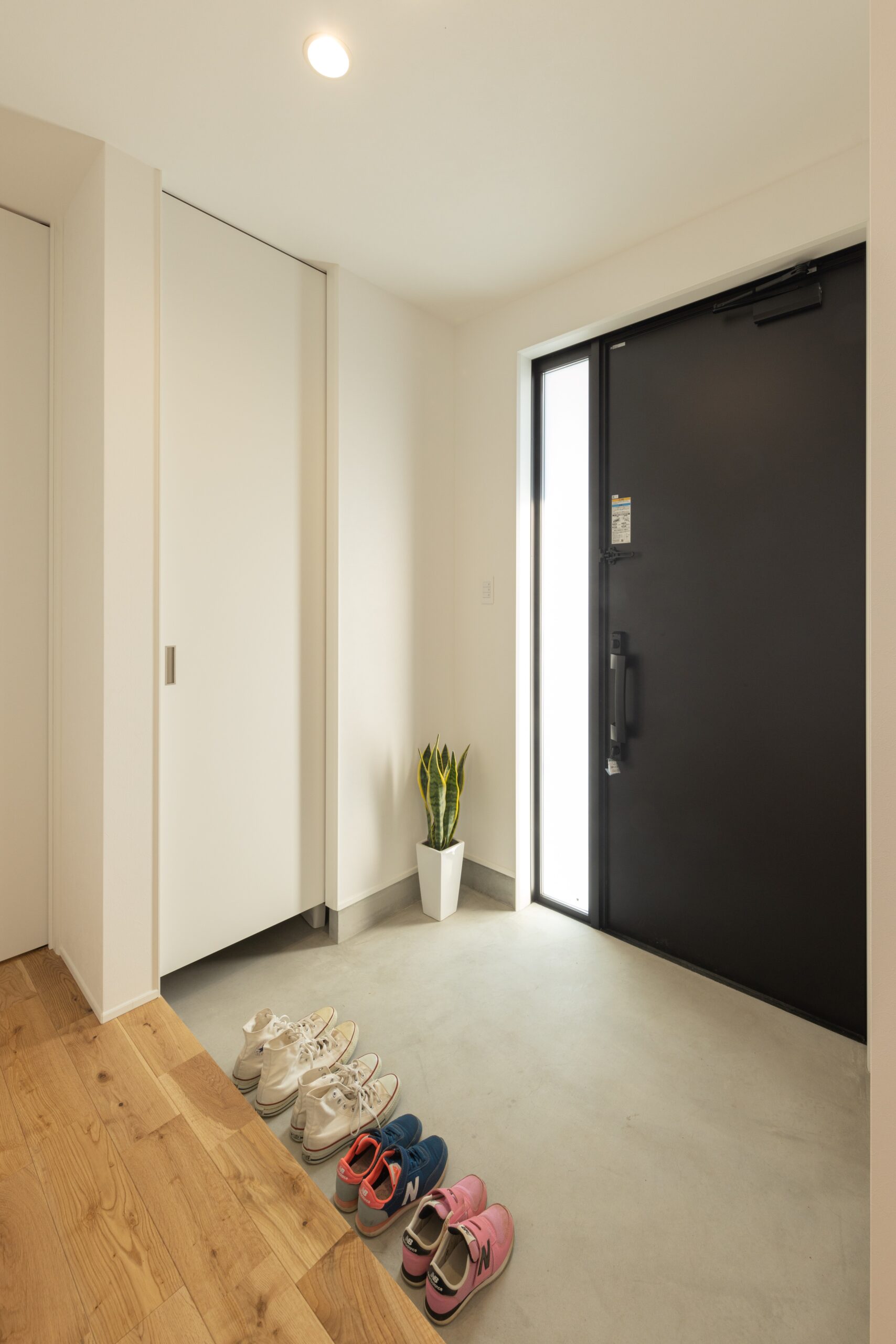 おしゃれなモルタルの玄関。広いシュークローゼットもあり、玄関はすっきり。