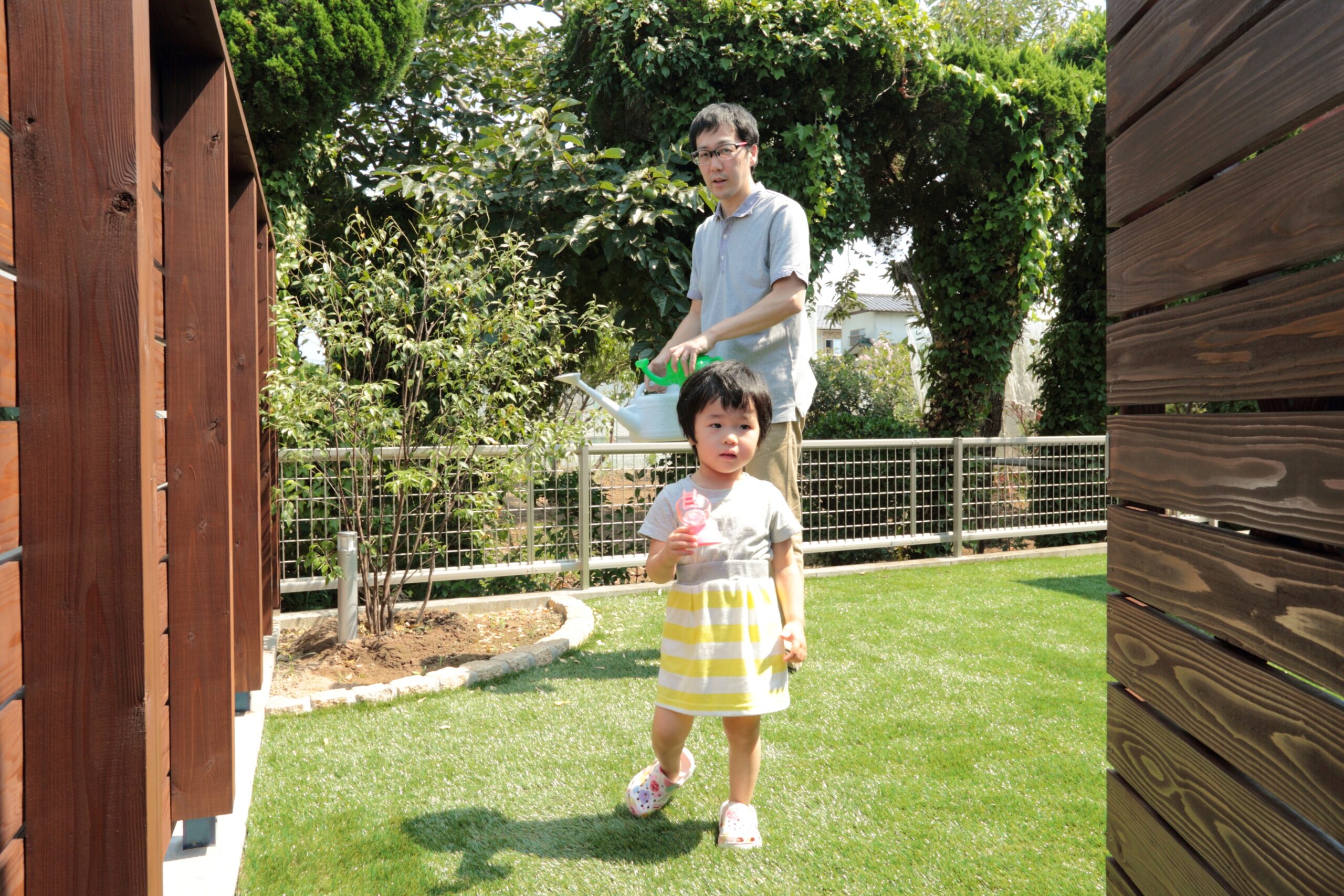 道路際にはウッドフェンスを立て、お隣の畑を借景にした内庭。開放感がありつつもプライベートな空間に。