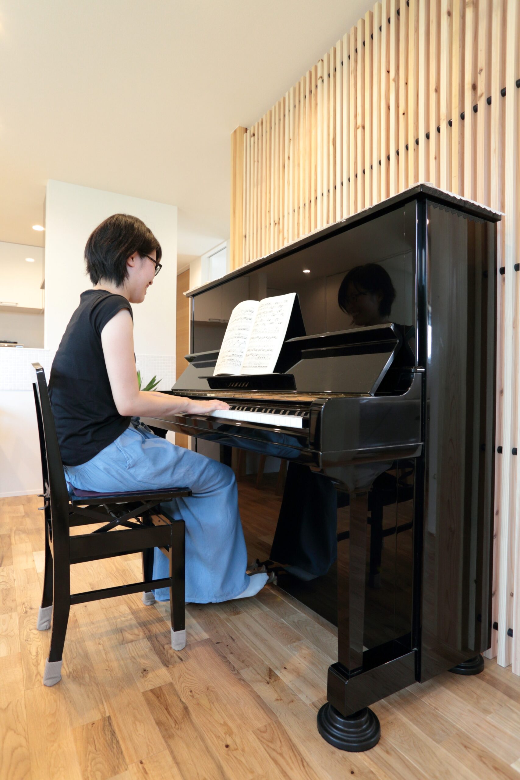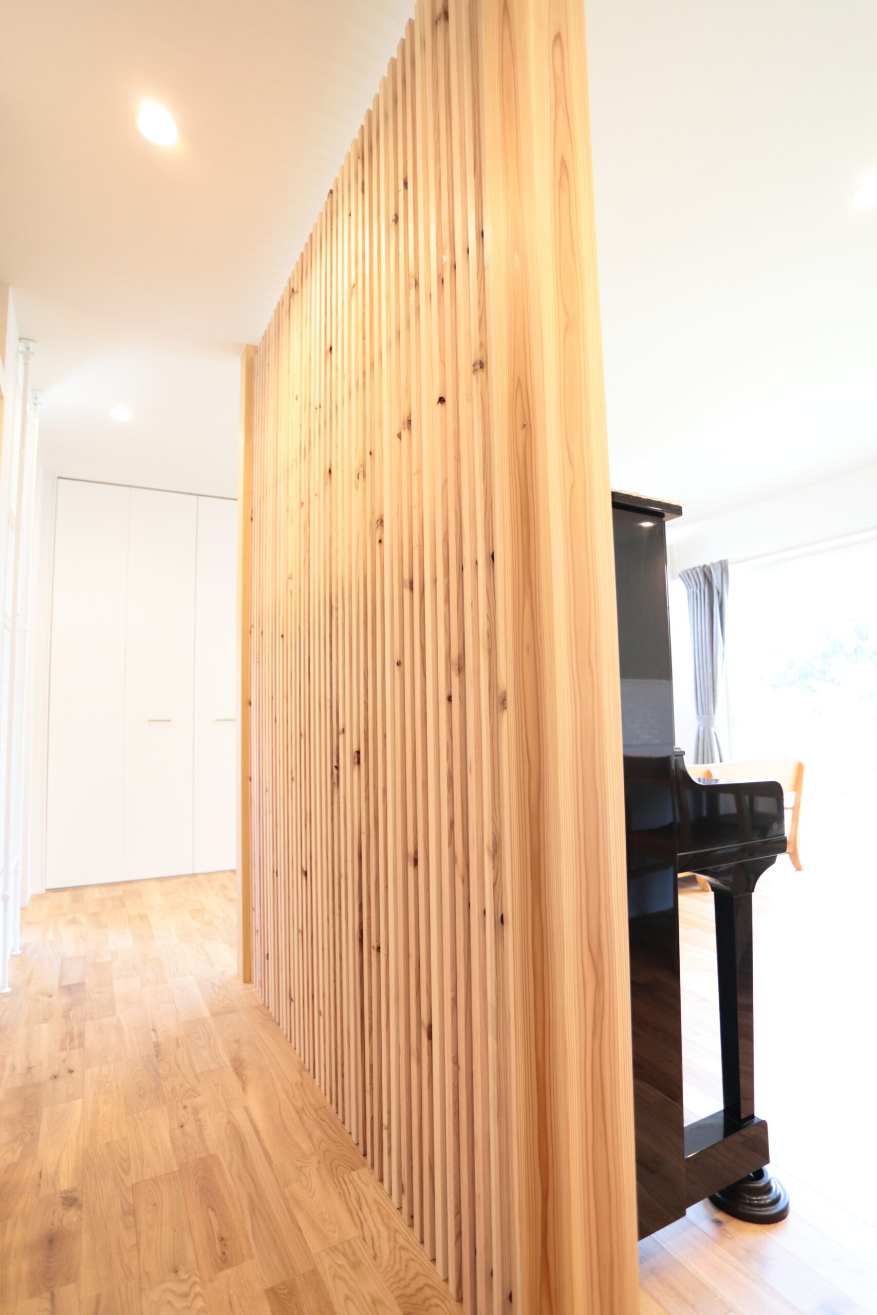 「建築家の先生がステキなプランを提案してくれて。特に気に入っているのがピアノの場所です」と奥さま。リビングで存在感を放つアップライトピアノは、奥さまの実家にあったもの。大型で置き場に困るものだが、玄関との目隠しに設置したルーバーを活用した。「またピアノに触れられるのがうれしくて」と笑顔がこぼれる。ご主人もピアノやギターを弾き、二 人で音楽を楽しむ時間が増えたという。「娘と一緒に鉢植えに水をやったり、庭で遊んだり。家族で楽しむ時間も多彩になりました」。