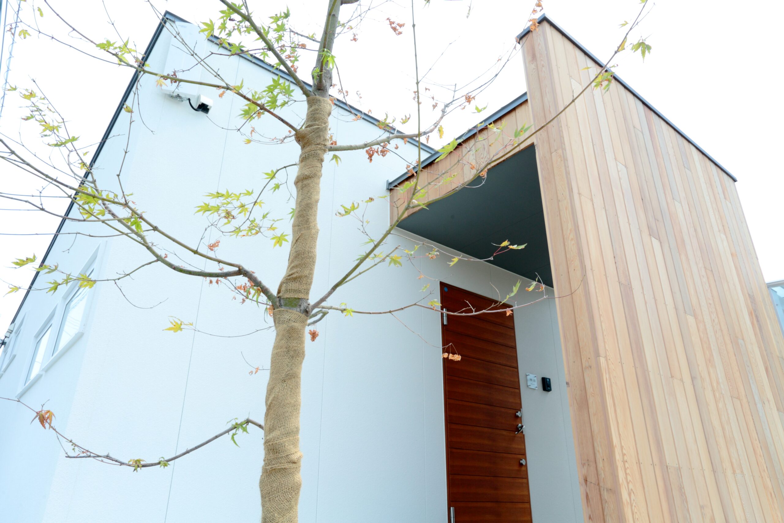 シンボルツリーがゲストを迎えてくれるエントランスは、白と木目がマッチ。