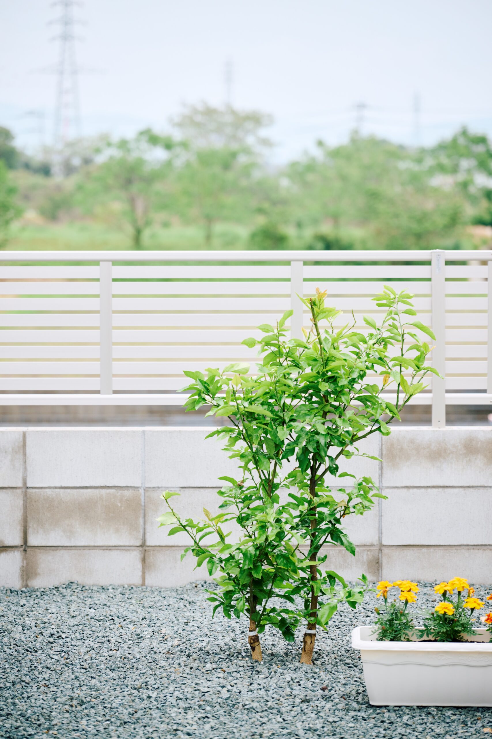 Kさん邸のシンボルツリーは『三善建設』から送られたレモンの木。「白い花を咲かせてくれるけれど結実はまだ。数年後の収穫が楽しみ」とご夫妻。