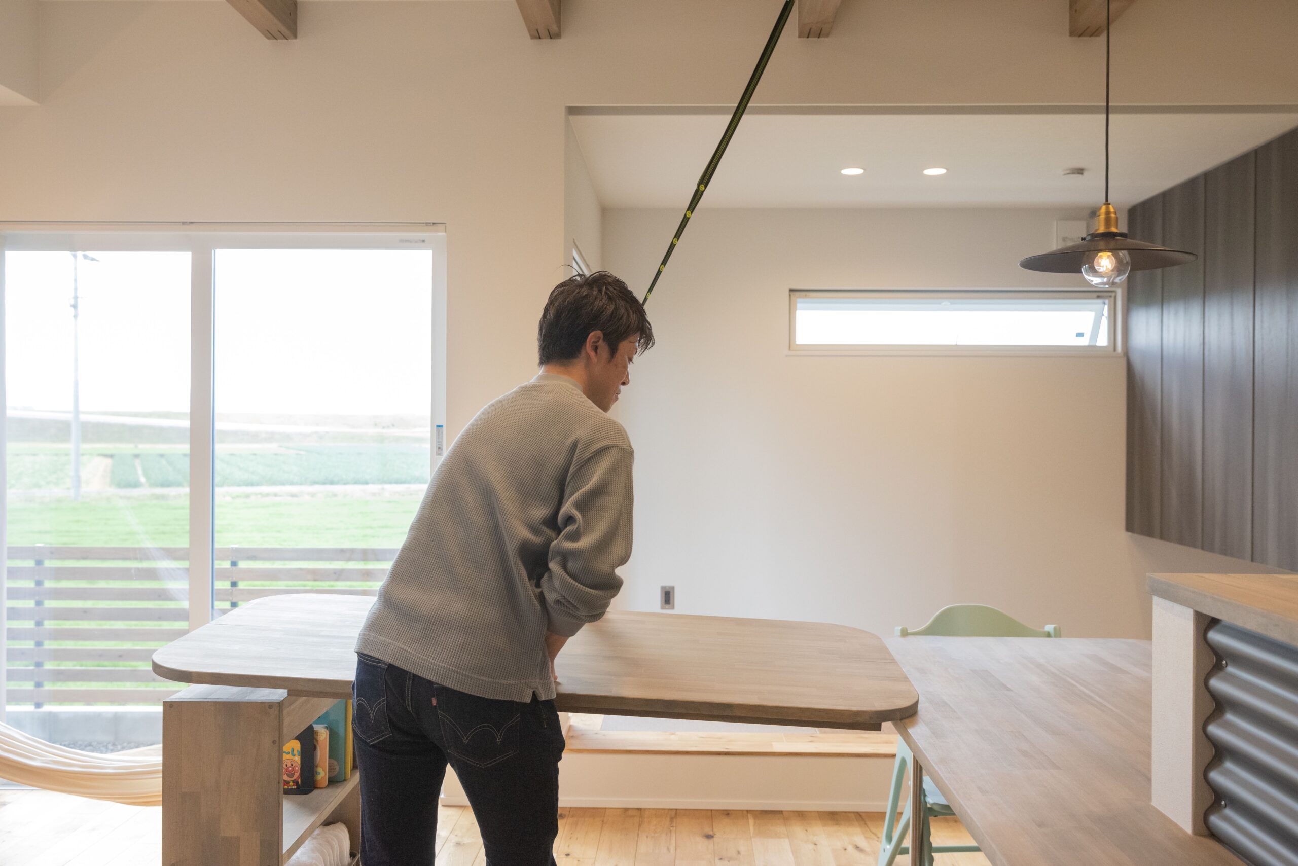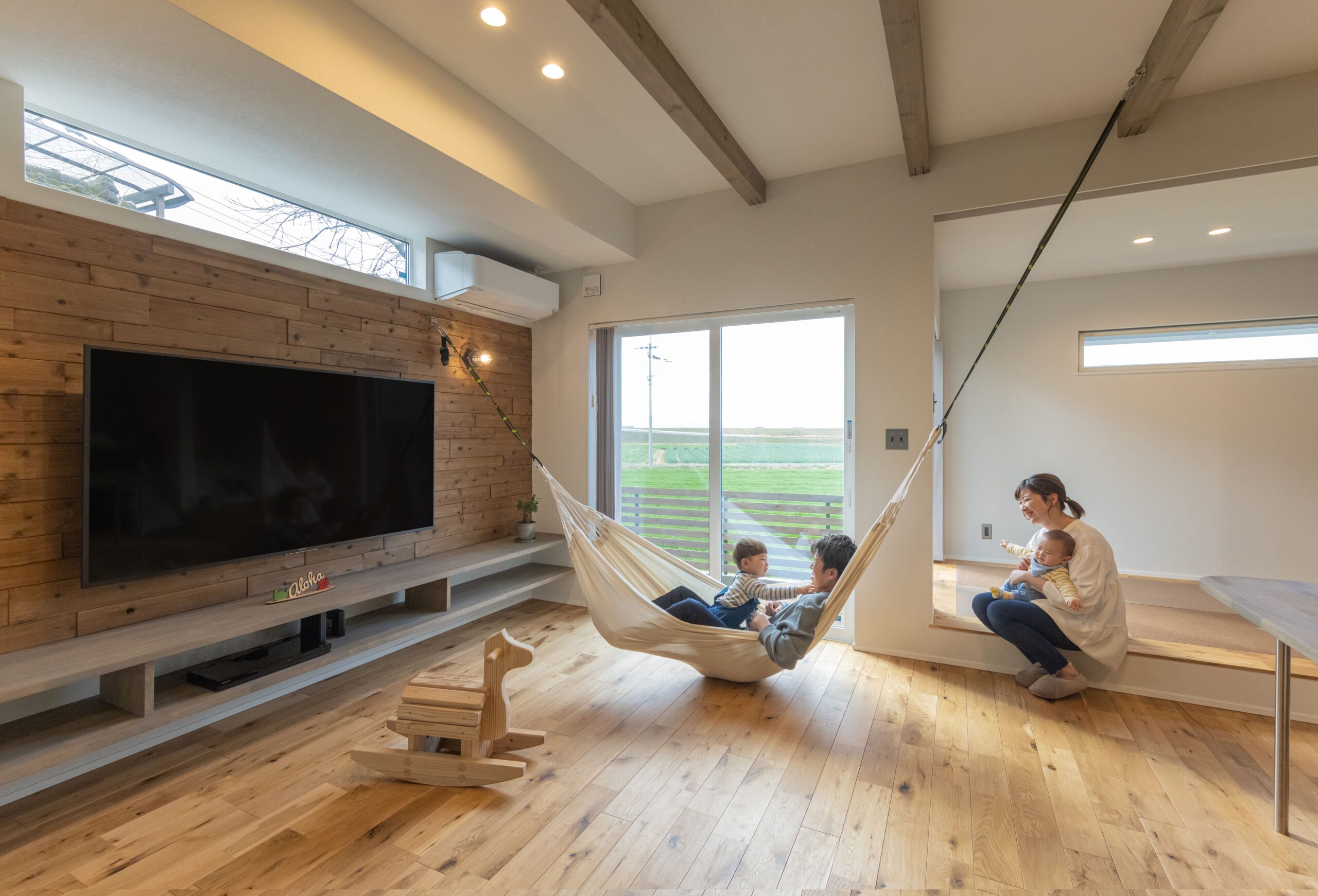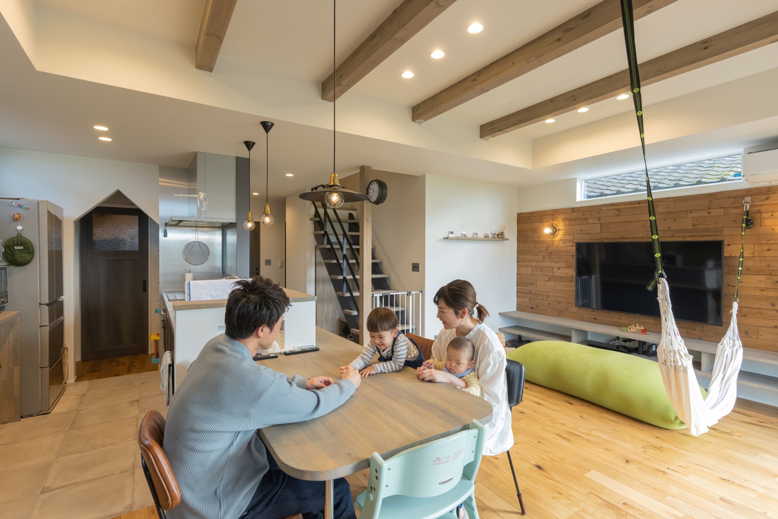 グレーのクロスをベースに、ナチュラルな木の質感で表情をつけたリビング。「僕が寝転んでいると、長男が飛び込んでくる(笑)」ため、ハンモックはあえて低い位置に。幸せな時間が溢れる、家族団らんの場が完成した。