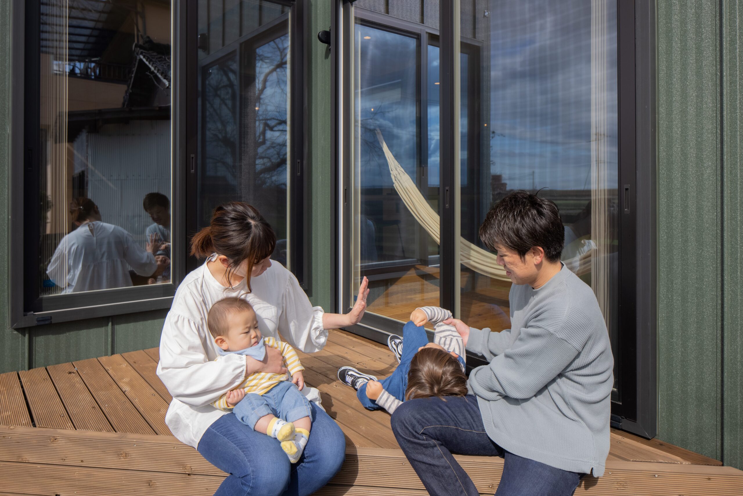 リビングと和室の両方からアクセスできるウッドデッキは絶好の遊び場。夏には念願の子どもプールやBBQをして楽しんだそう。目の前に広がる田畑を眺めて日向ぼっこも気持ちいい。