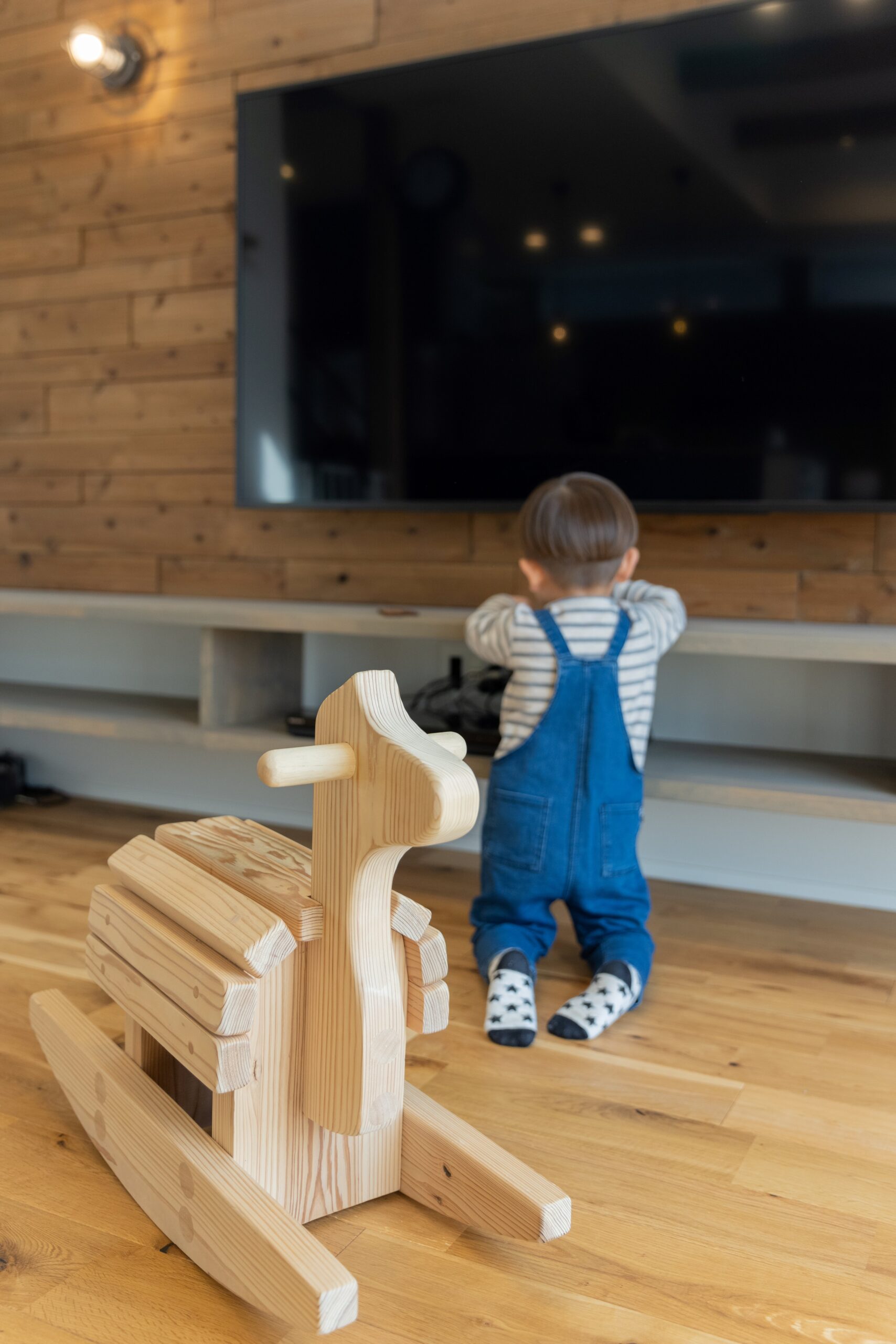 ランダムに木板を貼った壁面がリビング空間のアクセントに。棚はハウスメーカーの造作で、空間によく馴染んでいる。