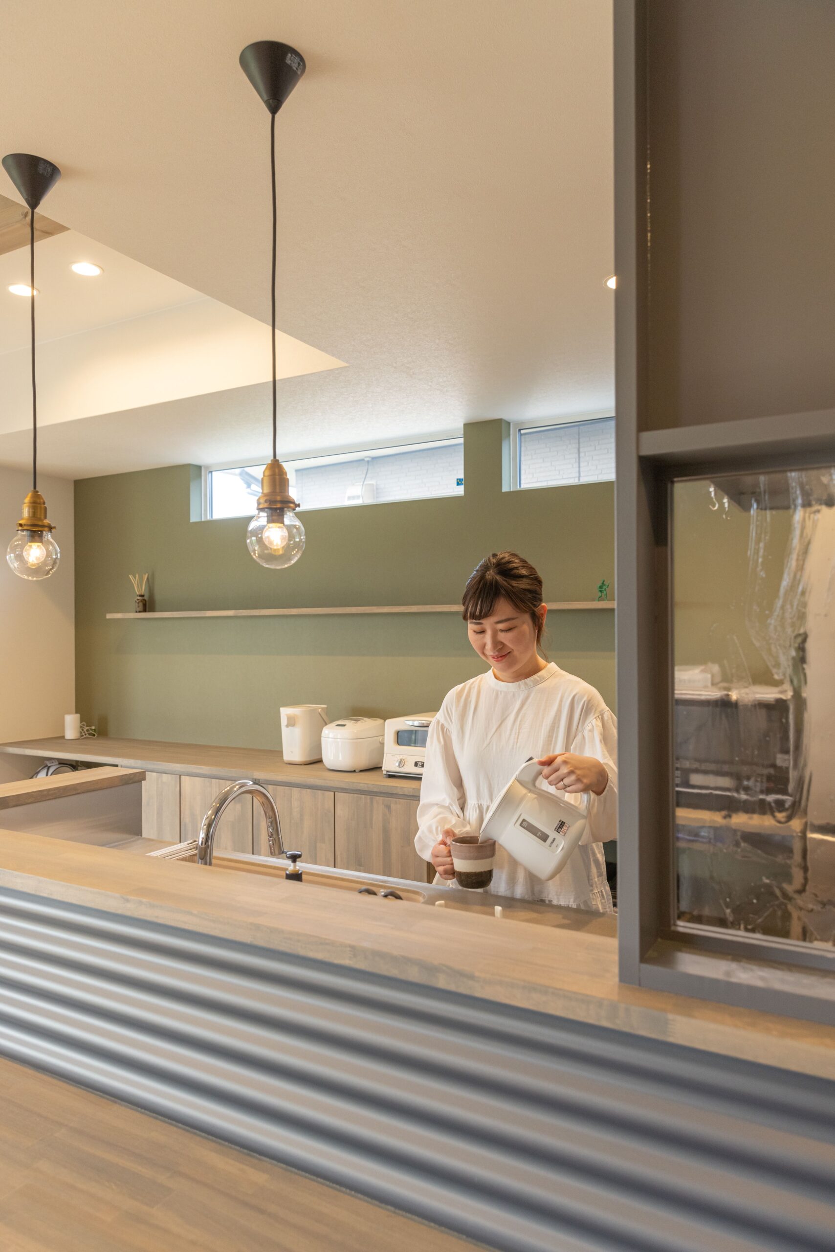 背の高い奥さまに合わせて天板を高くしたキッチンに「炊事がとてもラクになりました」とにっこり。奥の壁面にだけ配した落ち着いたグリーンのクロス、ゆるやかなゾーニングの役割を果たすガラスの建具、ガルバリウム鋼板を設えたキッチン背面など、空間の細部までこだわりが光る。
