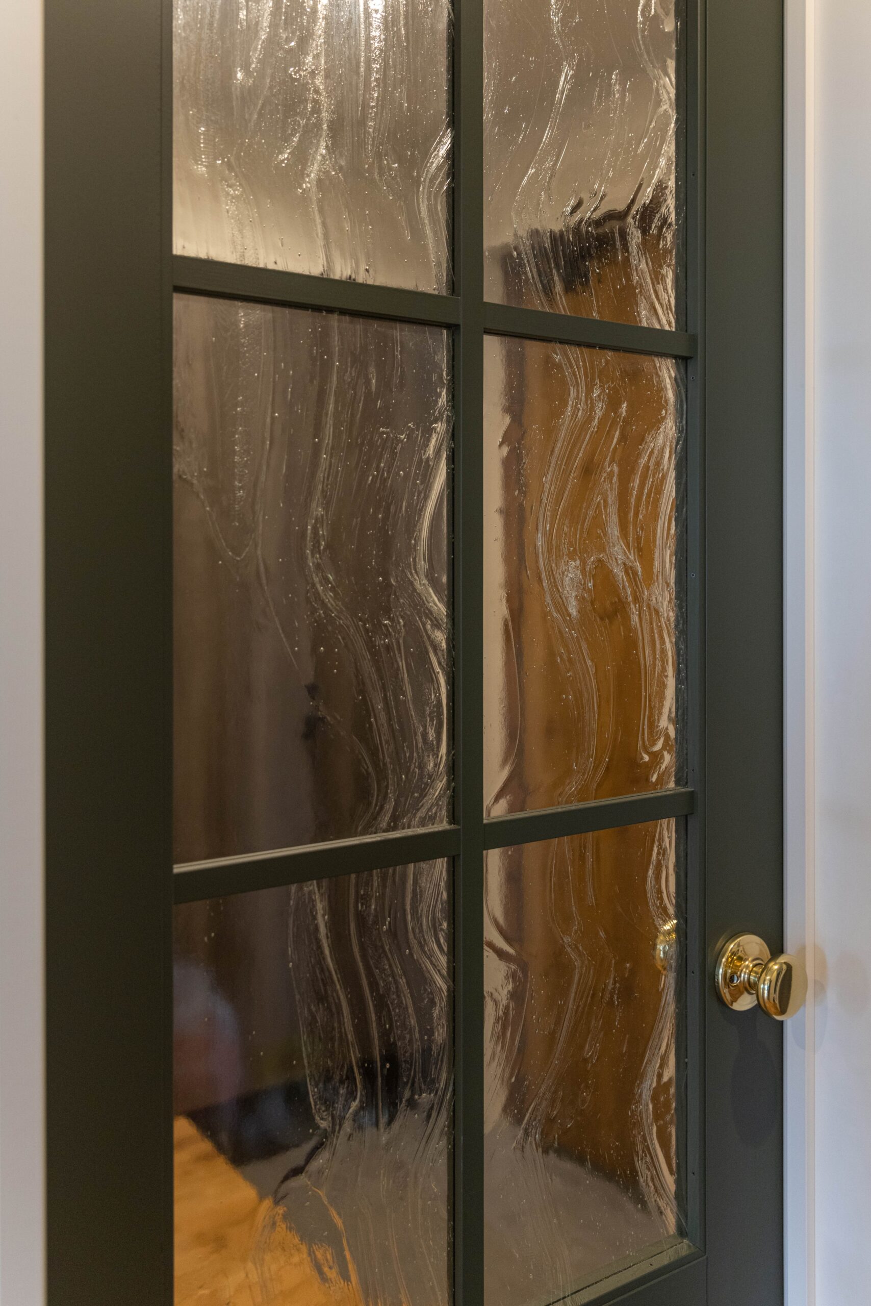 玄関ホールとLDKをつなぐ扉。ここにも奥さまが大好きなグリーンを採用。表情のあるガラスを取り入れ、家族の出入りをやさしく見守れるようにした。