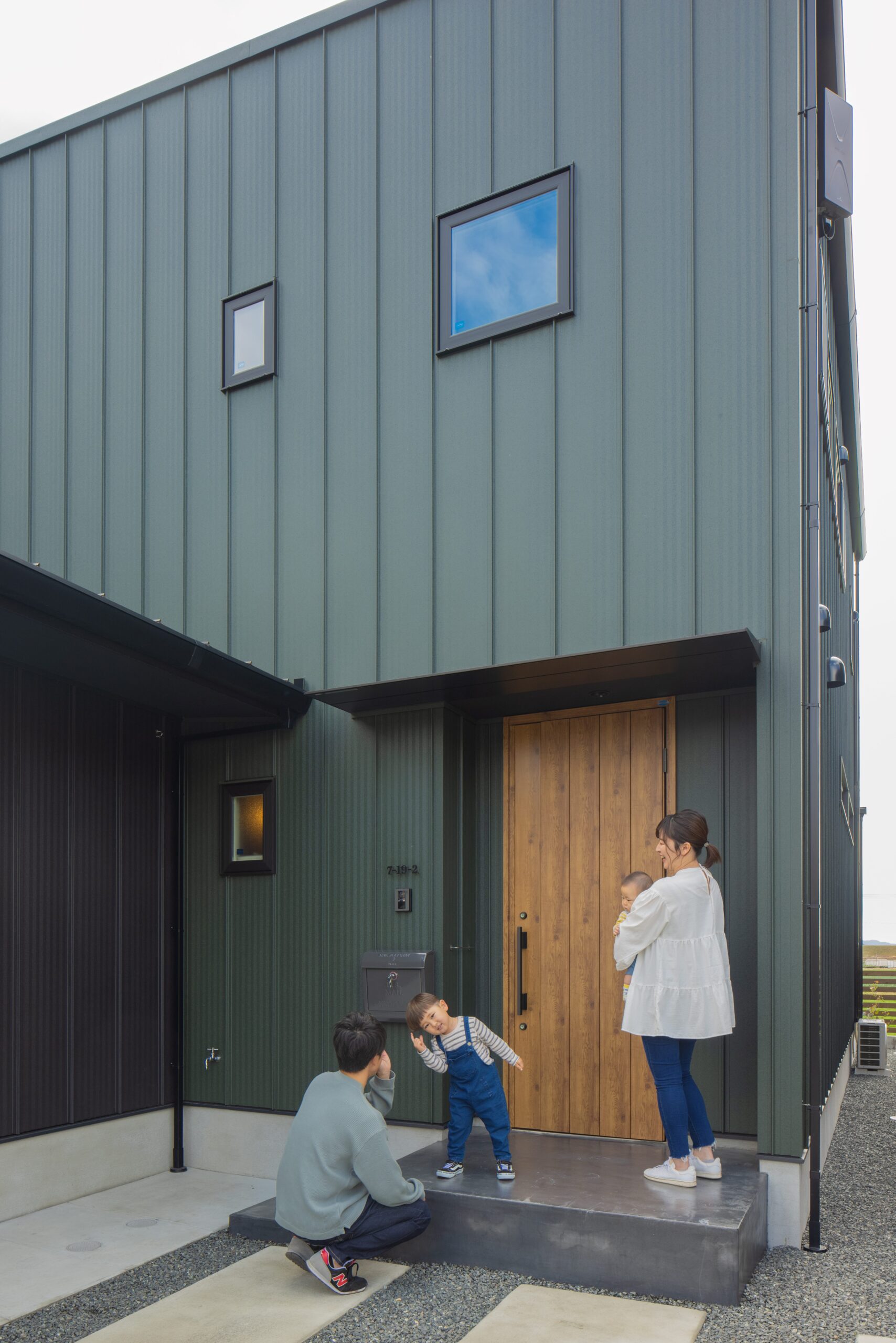 大好きなグリーンで仕上げた外観。ナチュラルな玄関ドアがアクセントに。車通りの多い道路に面した土地ため、一番奥にLDKを配置。静かな環境と、窓の向こうに田畑が広がるのどかな眺望を叶えた。