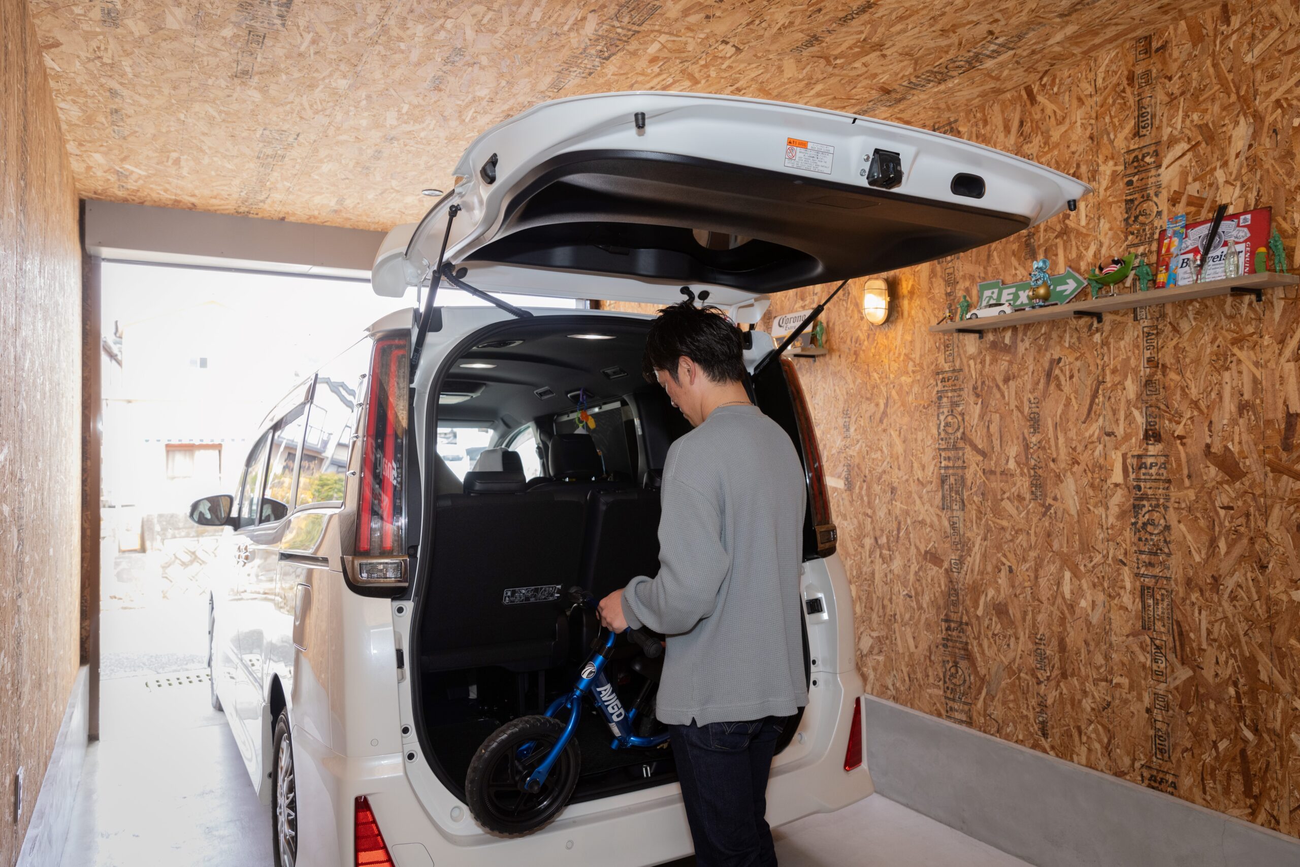 ご主人念願の屋根付き収納スペース。車からの荷物の出し入れも快適。
