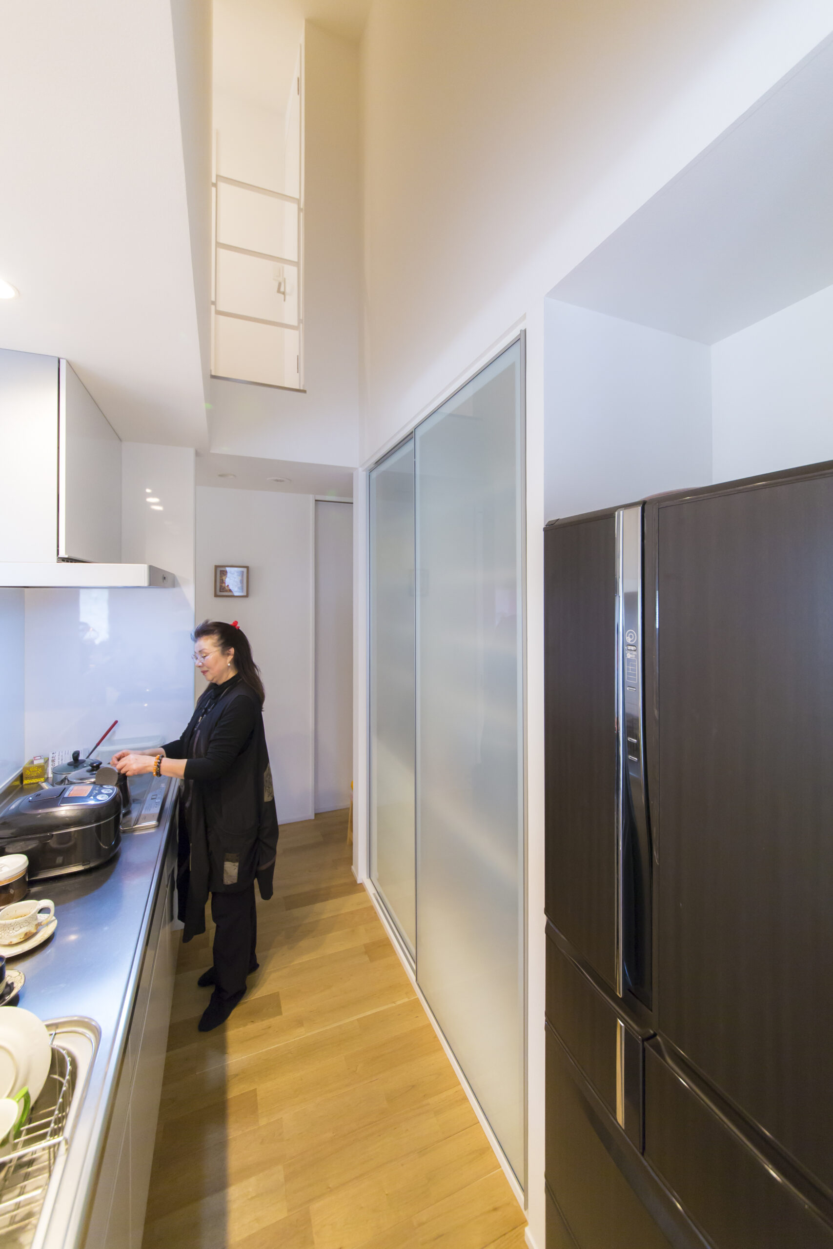 収納たっぷりのキッチン。天井を吹き抜けにすることで開放感をプラス。