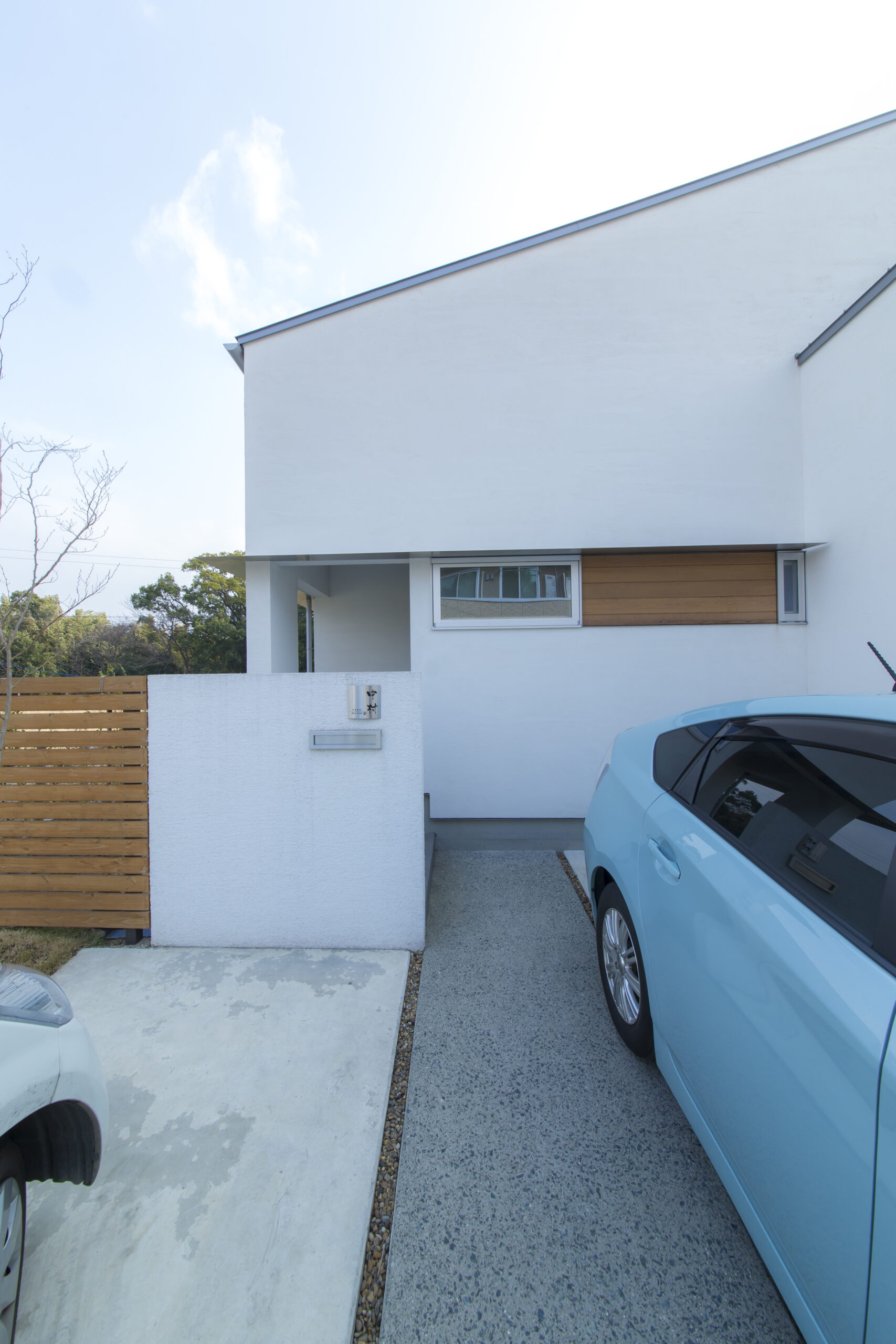 大きく設けられた窓からこぼれる灯りが、家人を優しく迎える。白を基調としたシンプルな外観は、飽きの来ないデザイン。日中は爽やかで上品な印象に。