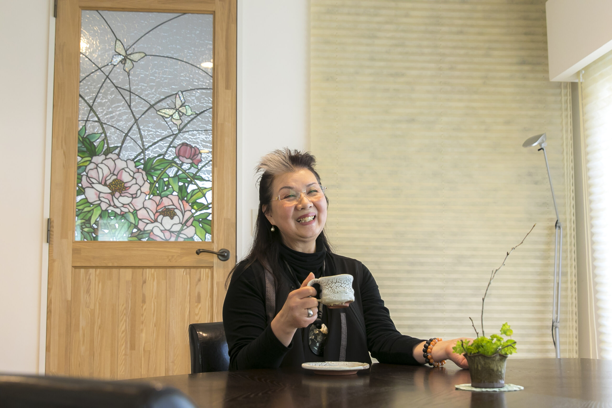 「家でゆっくりする時間は少なくて」。ステンドグラス、着付け、伝統芸能など習い事に励む毎日。そんななか、帰り道に遠くから家の灯を見ると、安心感と幸せに包まれるというNさん。「やっぱり我が家はいいですね」。多忙な時間の合間を縫って、お気に入りの窓際の席で大好きなコーヒーを飲むのが至福のひととき。豆を自家焙煎し、 数あるコレクションの中から器をセレクト。丁寧に入れたコーヒー を、ひとりでゆっくり、または友だちとお喋りしながら楽しむ時間 が、日々に潤いを与えている。